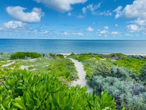 I stayed in a gorgeous three-bedroom suite featuring a beautifully furnished living room, a fully appointed kitchen, a dining room with seating for at least eight people, two primary suites – each with a garden shower and tub, and a third smaller bedroom and additional bathroom, and a laundry room with washer and dryer. But the most spectacular thing about the villa was the backyard with its swimming pool and fantastic ocean view. From the back patio is a path that leads to the beach. And the view from the villa was, needless to say, stunning. I made good use of the pool and the hammock in my private backyard paradise. A daily morning walk on the beach at sunrise was one of my favorite pastimes during my getaway.